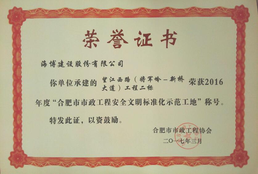 望江西路(將軍嶺路-新橋大道)建設工程二標是空港產業新城與主城區重要通道,該工程積極開展安全生產文明施工標準化管理成效顯著,近日榮獲合肥市2016年度“市政工程安全文明標準化示范工地”。同時,該工程受到合肥市公路...