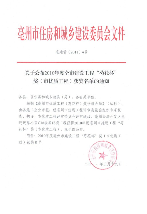 熱烈祝賀由安徽海博建設(shè)工程有限公司亳州項(xiàng)目部承建的亳州經(jīng)濟(jì)開(kāi)發(fā)區(qū)拆遷還原小區(qū)C1#、C2#、C3#、C5#號(hào)樓四個(gè)單位工程榮獲2010年度亳州市優(yōu)質(zhì)工程“芍花杯”獎(jiǎng)。