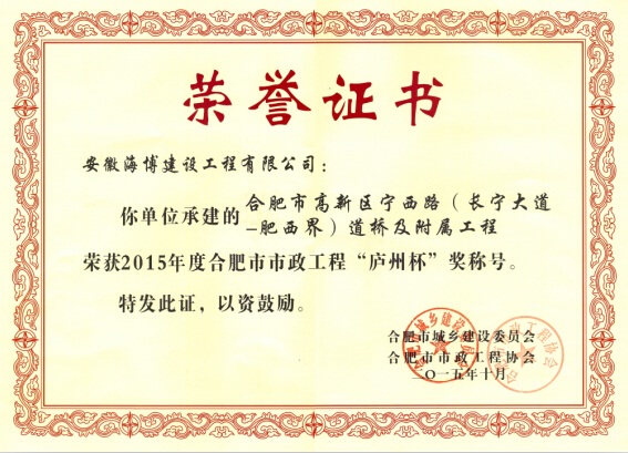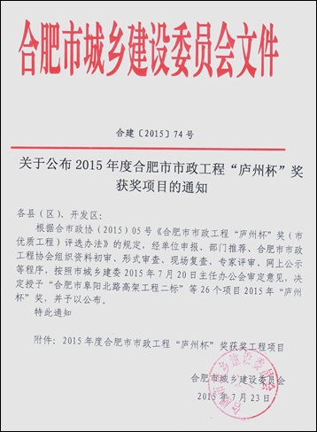 炎炎夏日,驕陽似火,我公司喜獲2015年度合肥市市政工程“廬州杯”獎,給酷熱的盛夏送來了陣陣涼意。由公司承建的合肥市高新區(qū)寧西路(長寧大道-肥西界)道橋及附屬工程經(jīng)合肥市城鄉(xiāng)建設委員會及合肥市市政工程協(xié)會審定,順利獲得此次獎項。
