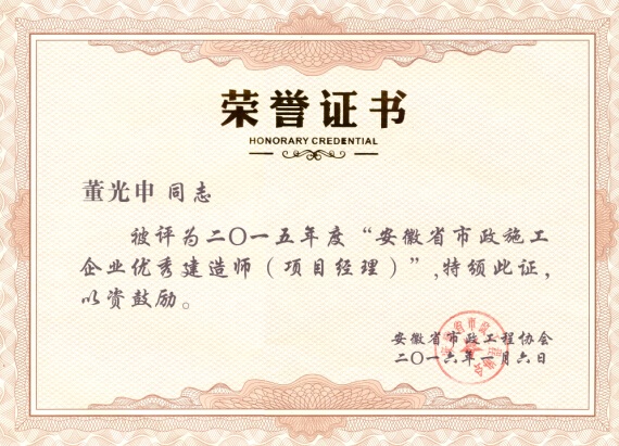 近日,從安徽省市政工程協會獲悉,我公司董光申、趙洋、徐結南三位同志被評選為2015年度“安徽省市政施工企業優秀項目經理”,此次全省共評選出66位市政優秀項目經理,恭喜上述三位同志獲得此殊榮。