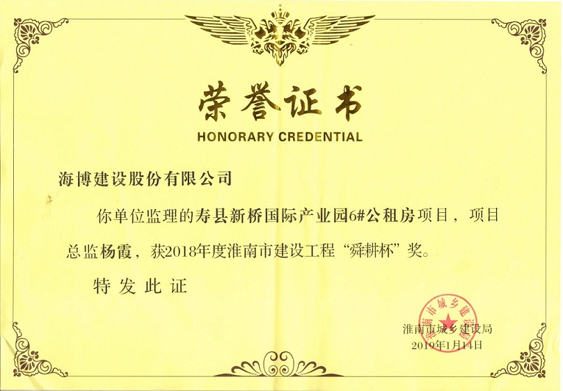 日前,淮南市城鄉(xiāng)建設(shè)局公布了2018年度淮南市建設(shè)工程優(yōu)質(zhì)工程獎名單,我司承擔(dān)監(jiān)理的壽縣國際產(chǎn)業(yè)園6#公租房項目喜獲2018年度淮南市建設(shè)工程“舜耕杯”獎。