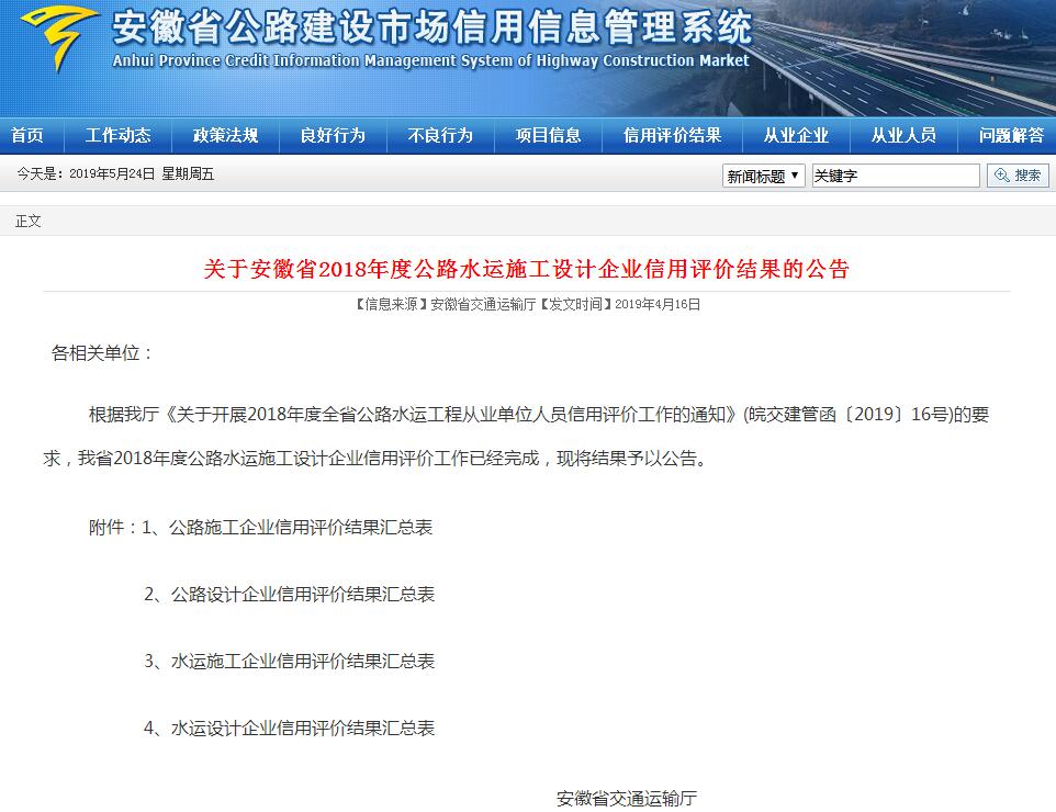 近日,安徽省交通運輸廳公告了“安徽省2018年度公路水運施工設(shè)計企業(yè)信用評價結(jié)果”,我公司被評為省級公路施工行業(yè)最高等級“AA”級信用企業(yè)。