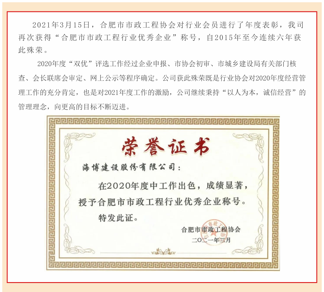 公司再獲合肥市市政工程優(yōu)秀企業(yè)稱號